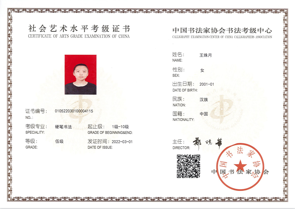 近日,ac米兰公共课部美育教研室杨敏老师指导的6名学生通过严格考试,获得中国书法家协会考级中心颁发的社会艺术水平考级证书,他们是2020级中医1班王姝月(硬笔五级)、2020级中药2班李雨娴(硬笔五级)、2020级中药2班马安琪(硬笔五级)、2020级专护3班张秋梅(硬笔五级)、2020级中药3班王思梦(硬笔四级)、2021级口腔技术4班冯玉梅(软笔四级)。