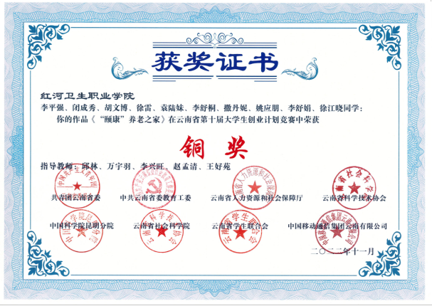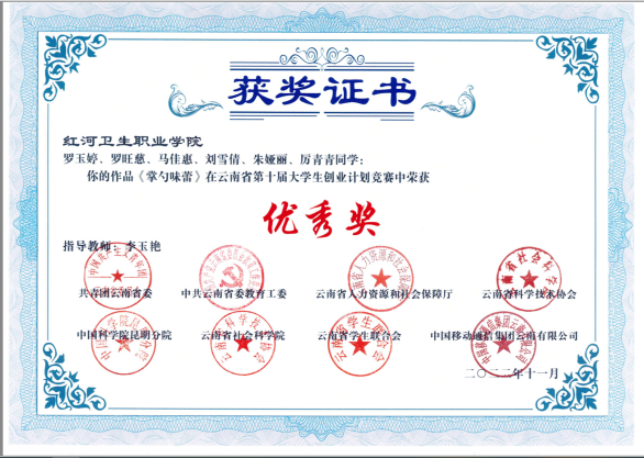 校团委精心组织,经过校赛从39个作品中评选出的10个优秀作品代表学校参加云南省赛,经过省级复赛、省级终审决赛答辩等环节,获得银奖1个、铜奖5个、优秀奖3个。其中公共课部王红亮、苏玉龙老师指导的作品《艾小满健康科技有限公司》、万宇羽老师指导的作品《“颐康”养老之家 》、李玉艳老师指导的作品《掌勺味蕾》、赵健美老师老师指导的作品《 “低碳”膳食 》分别获得银奖、铜奖、优秀奖、优秀奖。