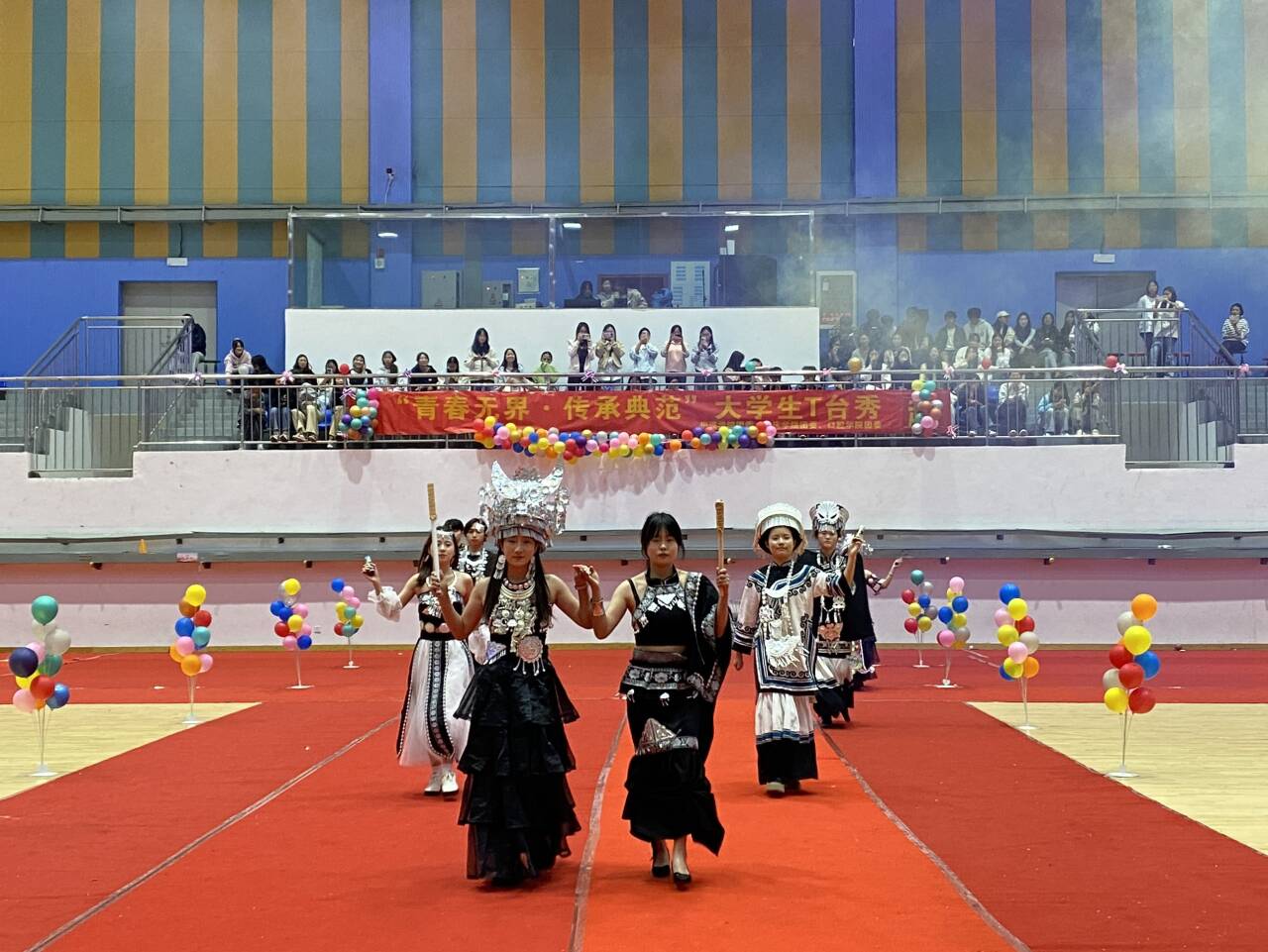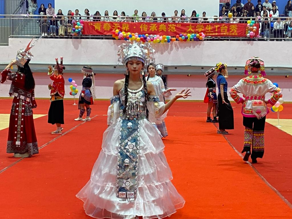活动在活力四射的开场舞中正式拉开帷幕。整场 T 台秀以服饰为核心载体,用多元风格搭建起文化交流的舞台:古风组模特身着马面裙、传统汉服登场,衣袂翩跹间勾勒东方美学的雅致意境,尽显中华服饰的千年韵味;民族组队员身着各民族盛装踏歌而来,裙摆翻飞间彰显民族气魄,银饰碰撞的清脆声响中诉说着古老的民族传奇。