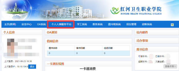 四、进入人事系统后,依次单击 “个人信息”→“信息维护(申请)” →“修改”,然后补充邮件和联系电话的信息后,点击左上角的“提交”,提交后“信息维护(申请)”会变为“信息维护(待审核)”,待人事科审核通过后,个人信息的完善即为成功。预计1个日历日后,各位教师可通过电子邮箱找回个人的数字校园密码,不再需要人工介入。