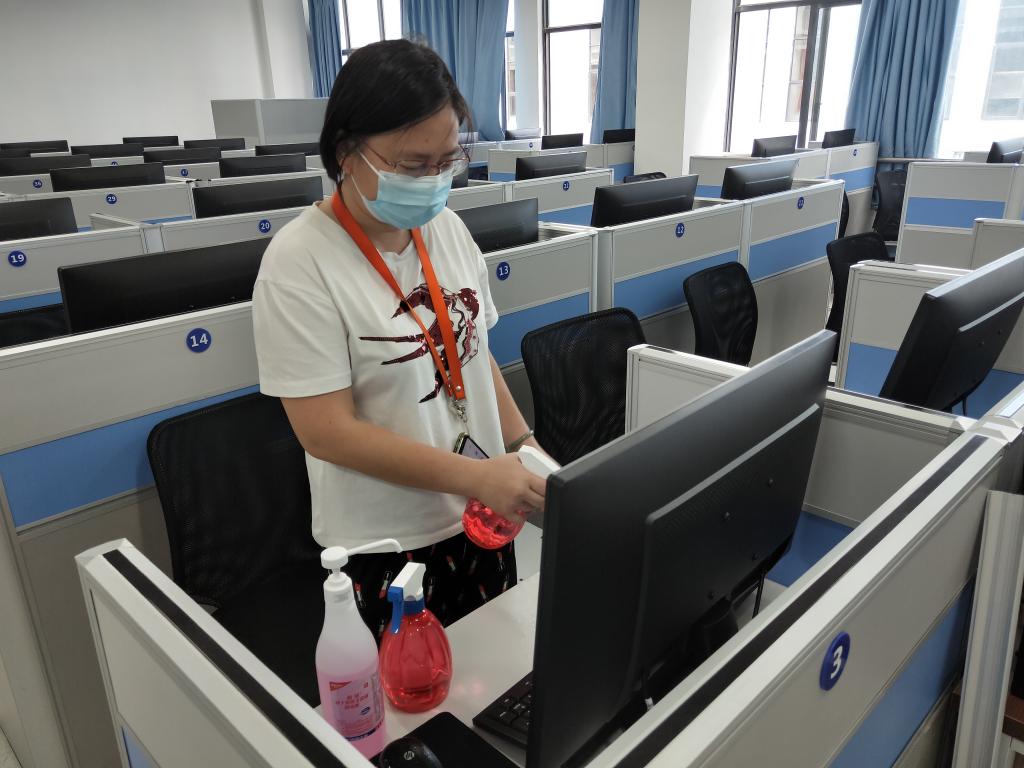 为了保障疫情期间考试的顺利进行,州疾控中心、学校防控办积极为考试防疫工作提供指导并保障物资。考前、考中及考后,州疾控对所有机房地面进行消杀,教育技术中心使用防控办提供的酒精对桌面、鼠标、键盘进行消毒,为考生和学生创造了安全的计算机使用环境。