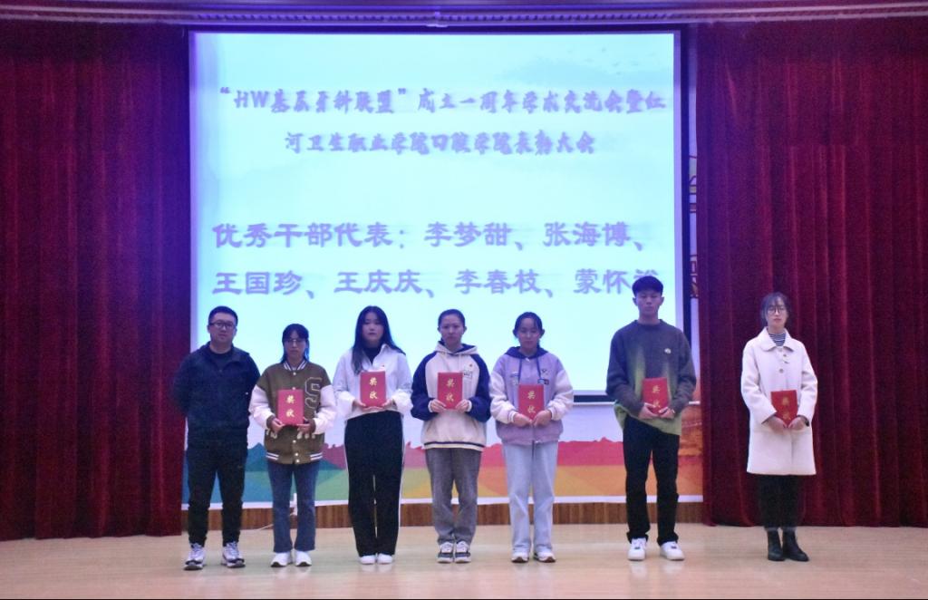 最后为获奖班级及学生个人颁奖。本次获得口腔学院优秀干部称号的同学是:李梦甜,张海博,王国珍,王庆庆,李春枝,蒙怀裕等29名优秀干部。