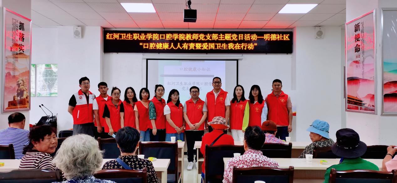 党的十九大对党中央、国务院发布《“健康中国2030”规划纲要》作出重大决策部署,强调坚持预防为主,倡导健康文明生活方式,预防控制重大疾病。口腔是消化道和呼吸道的起始端,具有咀嚼、吞咽、言语、感觉等功能,口腔健康是全身健康的基础。为推进落实预防为主,实施健康中国行动,口腔学院教师党支部于2023年4月14日到明德社区为部分居民开展“口腔健康,人人有责暨爱国卫生我在行动”的主题党日活动。