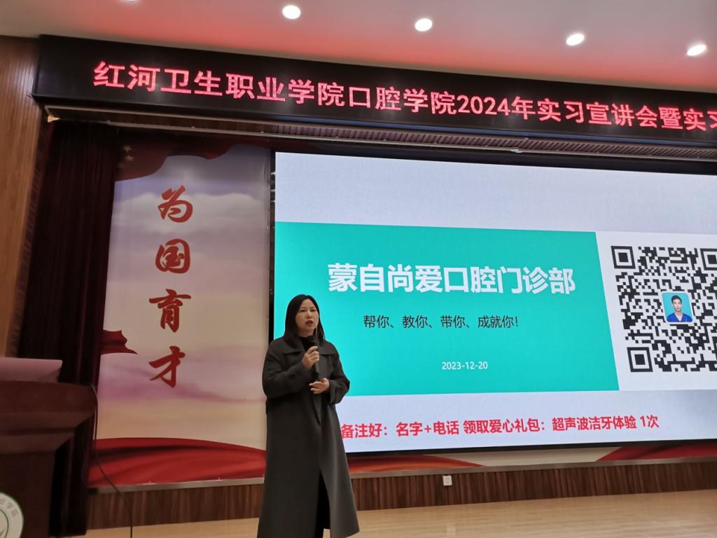 为拓宽口腔学院2022级学生实习渠道,搭建实习生和用人单位之间的交流平台,加强校企联系,全面推进口腔学院实习工作,口腔学院于2023年12月20日分别在图书馆报告厅与实验实训楼阶梯教室开展口腔医学专业、口腔护理专业、口腔医学技术专业实习宣讲会,本次活动邀请到省内外30家企业代表做了现场宣讲。