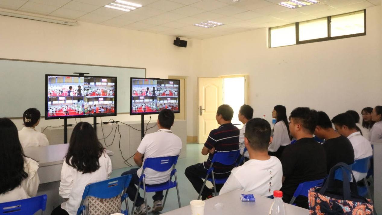中共红河州委教育工委副书记、州教育体育局党组书记、局长张学理(左二)查看大赛准备情况。