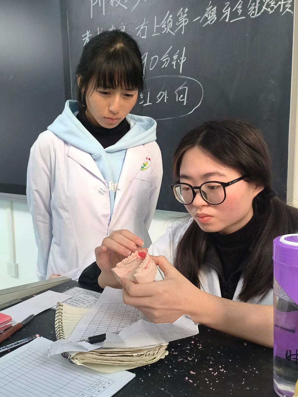 在实训过程中,学生们认真聆听吴婵师傅的指导,仔细观察每一个操作步骤,并在师傅的耐心纠正下反复练习。从人工牙的选择与打磨,到准确地在模型上进行排列,学生们逐渐掌握了可摘局部义齿前牙排列与后牙排列的关键技能,解决了许多在理论学习中遇到的困惑,专业水平得到显著提升。