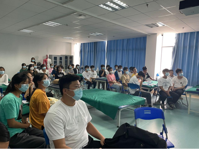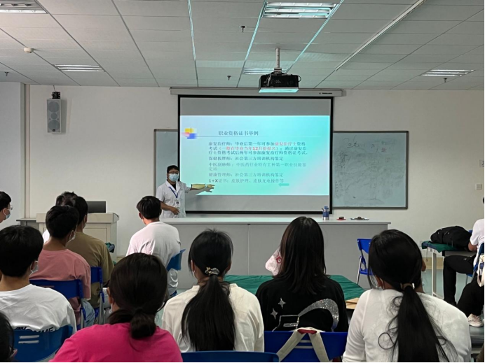 李旭老师从专业培养目标、职业面向、专业技能、课程安排、师资队伍等方面进行讲解,同学们对中医康复技术专业有了初步的认识。