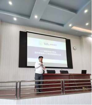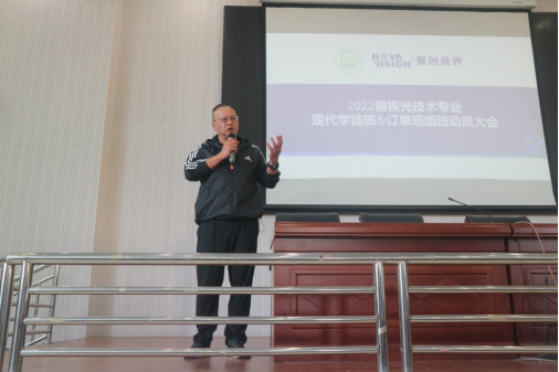 杨军副院长发表讲话,介绍学徒、订单班是眼视光技术专业特色育人模式,是与企业形成深度校企合作,双元制育人模式,旨在为企业输送高质量技术技能型人才,最终实现校、企、生三方共赢。表示希望同学们深入了解其培养模式,结合自身情况作出合适选择。