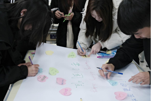 紧接着的“世界咖啡” 环节充满创意。每个小组讨论后,在画纸上写下本组最困扰自己的问题。同学们纷纷开动脑筋,围绕问题,用便利贴写下各自对于此问题的解决方法,然后在全班内帮其他组出谋划策,将便利贴小心翼翼地贴在写问题的画纸上。一时间,画纸上五彩斑斓的便利贴犹如盛开的花朵,数不胜数。随后,老挝留学生代表上台,用清晰的语言分享着他们小组的问题以及那些凝聚着集体智慧的解决方法。