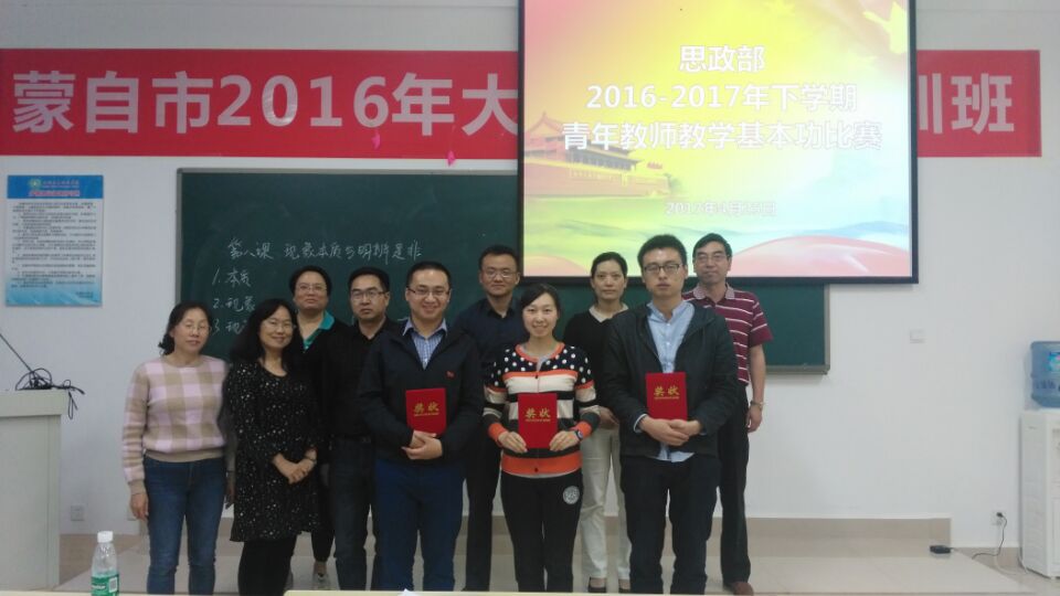 2017年4月25日下午17:00思政部在教学楼北109成功举行首届青年教师教学基本功大赛。此次比赛共有4位青年教师参赛,思政部其他教师为评委,思政部主任邱林老师主持了大赛。