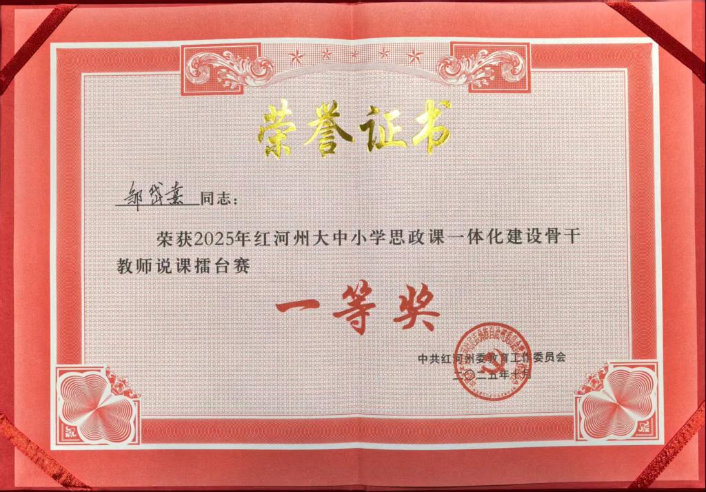 2025年10月27日,红河州大中小学思政课一体化建设骨干教师专题培训班在蒙自开班,此次培训班设置了专题辅导、现场教学、说课擂台赛等多元环节。在说课擂台赛中,ac米兰马克思主义学院邹岱熹老师与来自全州大、中、小学各学段的10名骨干优秀教师同台竞技。说课内容《以经验为钥,启“十五五”新篇——五大经验引领医学生成长》用精妙的构思深度融合学科知识与思政育人,荣获本次说课擂台赛一等奖!