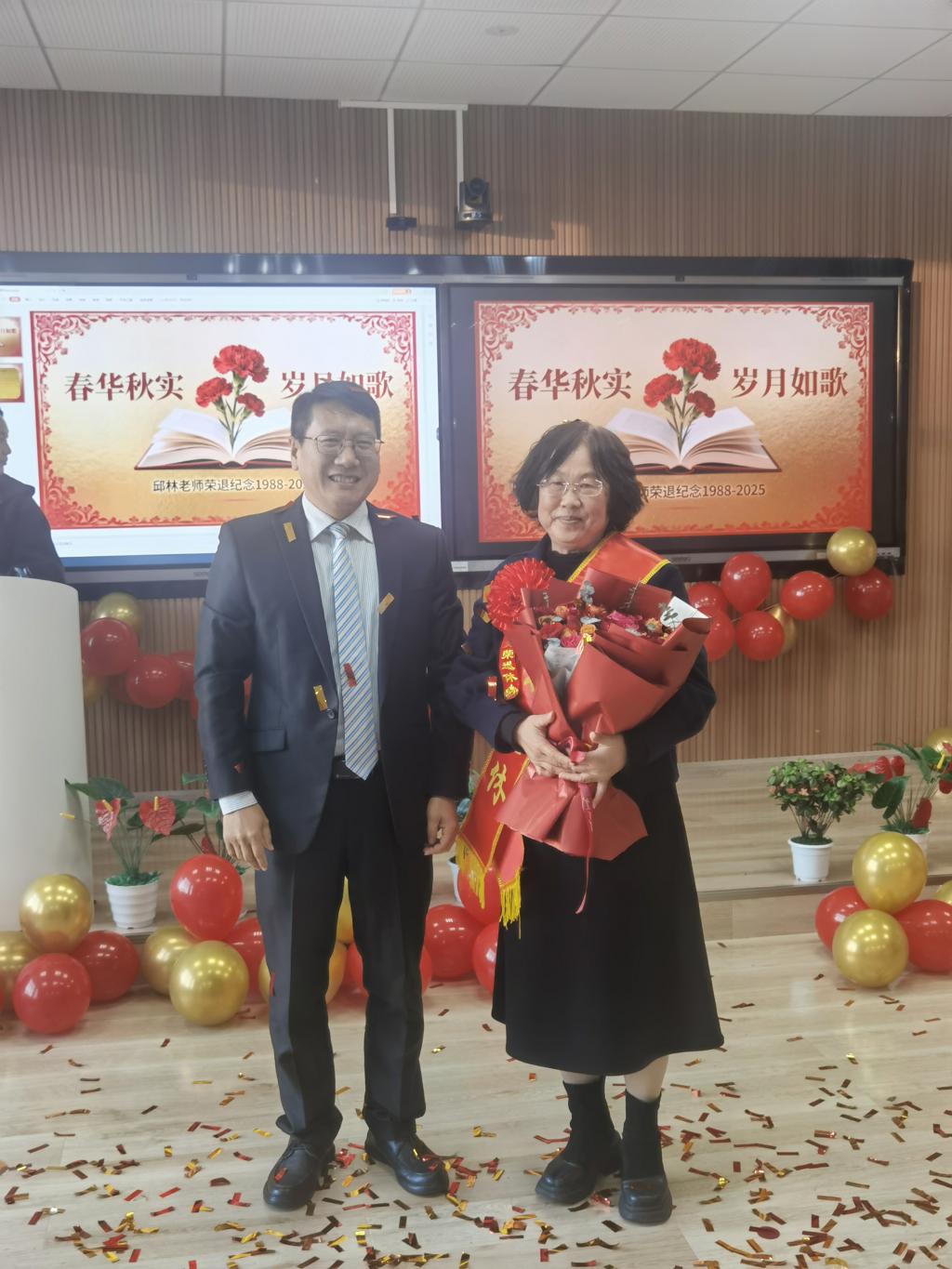歌声落定,王必成书记手捧一束鲜花缓步走向邱林老师,郑重地将鲜花送到她手中。鲜花象征着敬意与祝福,也承载着学校对邱林老师37年辛勤付出的深深感谢。邱林老师接过鲜花,与王必成书记紧紧握手,现场再次响起热烈的掌声。