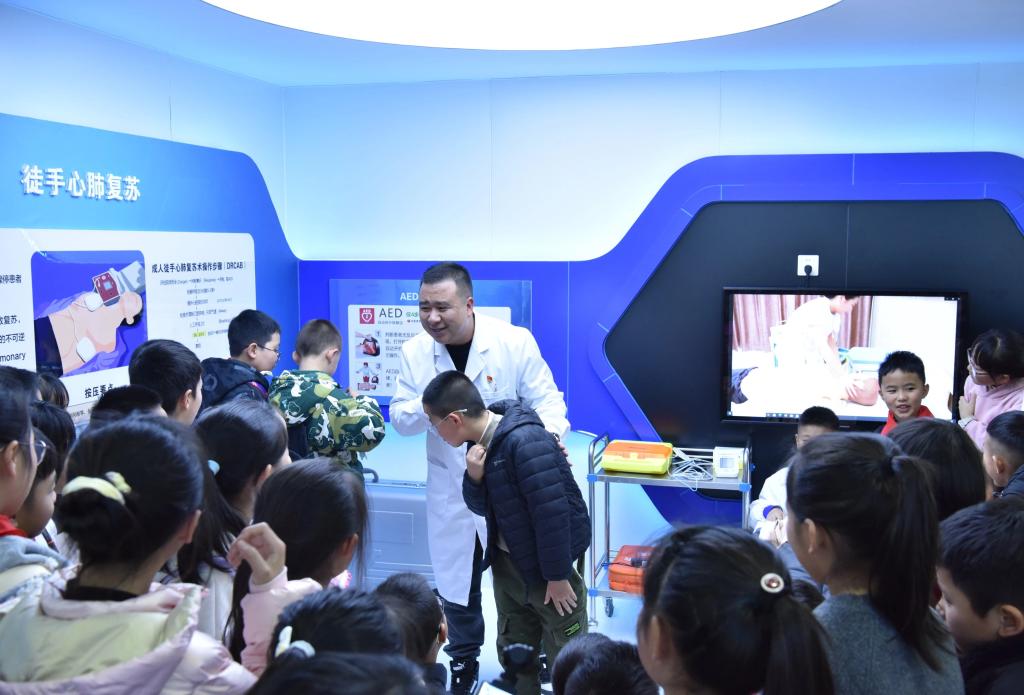 实训中心教工党支部钱俊成老师给同学们演示了现场心肺复苏的操作,其他老师手把手的教小朋友在模型人上练习“胸外心脏按压”。