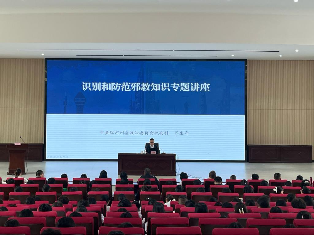 2024年11月20日,ac米兰官方中文网站举办识别和防范邪教知识专题讲座,邀请红河州反邪教警示宣讲团成员罗生奇主讲,学院党委委员、副院长李锋主持讲座。州教体局德育科主要负责同志、学院在家党政领导班子成员、各部门和二级学院中层干部、各党总支(支部)书记、辅导员、思政教师及学生代表等480余人参加讲座。