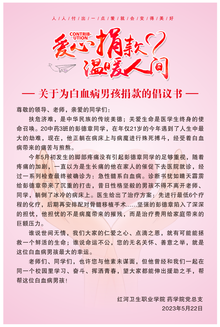 制作《为白血病男同学捐款》倡议书,在药学院微信公众号发布倡议书,各班级班主任利用班会时间广泛宣传发动,营造良好的捐助氛围,为开展好这次募捐活动做好准备。