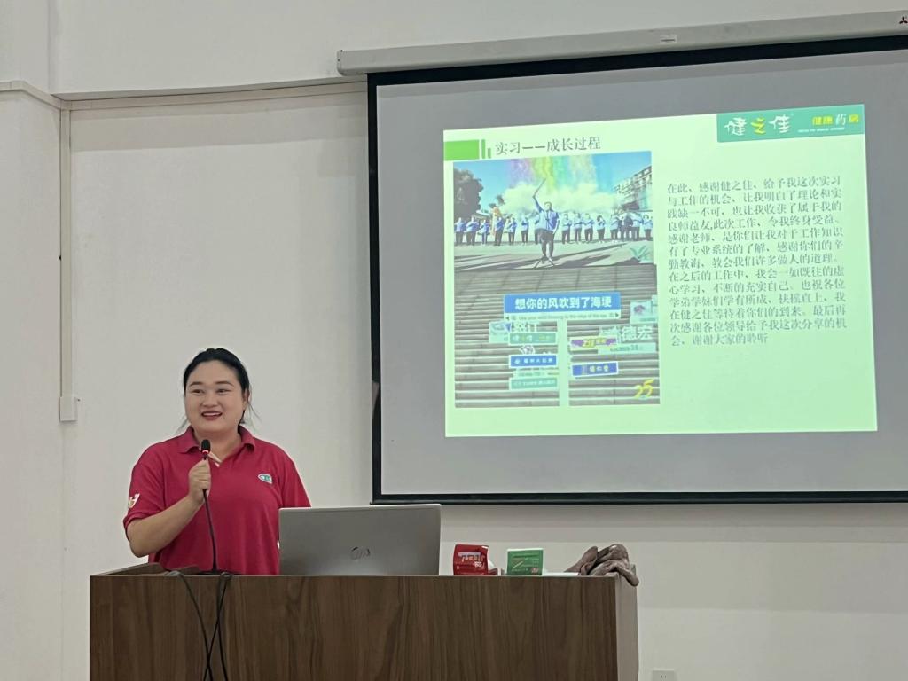 接下来,药学院优秀毕业生代表严之玲为同学们分享她在健之佳工作的经历与感受,用她在健之佳工作期间的经历为同学们展现了健之佳人团队协作、努力奋斗的精神,通过她的分享让同学们更进一步的认识到健之佳的企业文化。