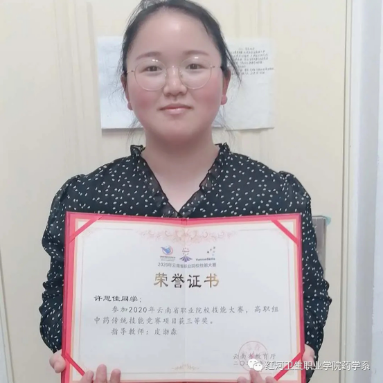高职组中药传承技能竞赛项目三等奖获得者许思佳同学: