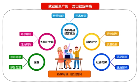 药品企业:药品生产企业(制剂生产、质量控制)、药品经营企业(药品购销、仓储管理、营销策划)、连锁药店(店长储备、健康管理)、医药电商平台(药品推广、客户管理)。