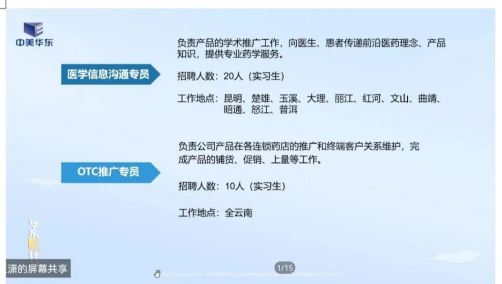 最后,介绍了在职培训和企业岗位在云南各州有分布。第一企业会根据同学的兴趣爱好和第一志愿选择相适应的岗位。第二如果在岗位上有什么不适应可以进行调岗。第三介绍了招聘岗位医学信息沟通专员招聘人数20人,OTC推广专员招聘人数10人,并向同学们发出呼吁。