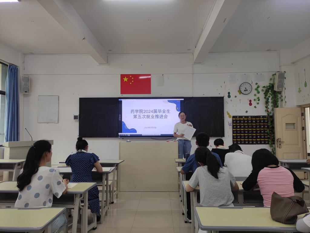 药学院2024届毕业生第五次就业推进会于5月30日在教学楼北208召开。药学院党总支书记张郴、副书记孙雨诗及2024届毕业班班主任、辅导员参加了本次会议,会议由药学院党总支副书记孙雨诗主持。