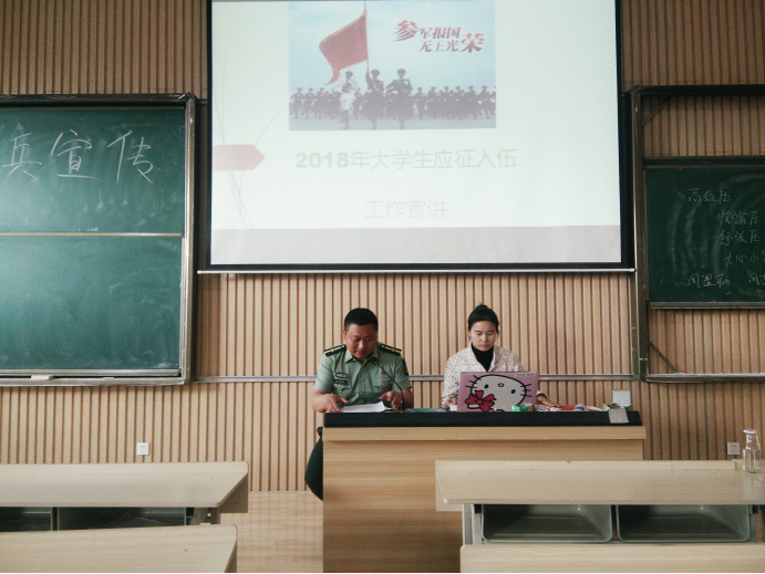 2018年4月19日下午4:20,为贯彻落实党的十九大精神和习近平强军思想,做好今年大学生征兵工作,药学系在图书馆大教室二进行了“征兵宣传动员大会”。武装部干事兼学生处处长助理王兴周、药学系梁杉、药学系全体男生及部分女生出席本次动员大会。
