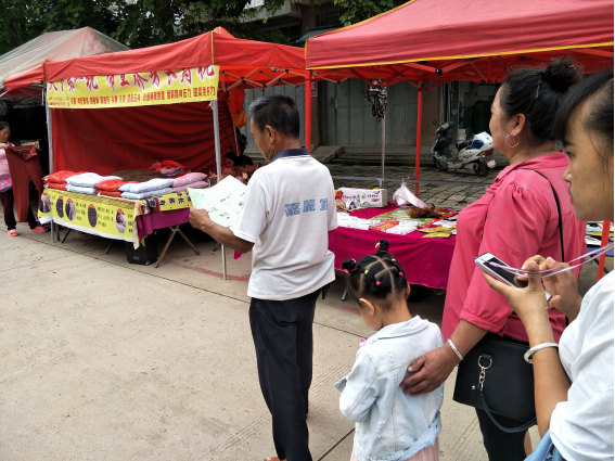 在新安所镇活动现场,志愿者团队搭建了服务咨询台,在服务咨询台上摆放了各类用药指导宣传资料、药学系专业介绍资料,以及大量的爱心物品--创可贴。台前围满了前来咨询和领取宣传资料的老百姓。志愿者团队一边向当地老百姓发放用药指导宣传资料,一边向他们讲解腹泻和感冒等常见疾病的用药选择知识。此外,我们的志愿者还不辞辛苦,走街串户对我们的老百姓进行安全用药知识的普及。