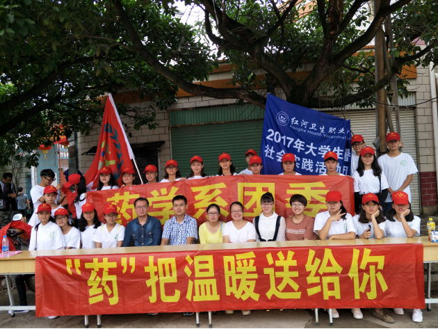 为深入贯彻落实党的十八大、十八届四中全会精神,学习宣传习近平总书记系列重要讲话精神,响应习近平总书记“我的中国梦”的号召和对青年“勤学、修德、明辨、笃实”的要求,进一步发挥学院药学系学科优势,锻炼我系学生创新实践能力;为加大对医疗服务的宣传力度,让老百姓更了解药品知识,提高用药常识,提高同学们的实践能力,让同学们从实践中收获经验,在实践中学会与人交流,2017年7月8日,在蒙自市新安所镇镇府的大力支持与帮助下,在学院团委的关心下,药学系党支部携同药学系团委组建了一支由35名师生组成的志愿者团队,到新安所镇开展了“‘药’ 把温暖送给你”为主题的“三下乡”社会实践活动。