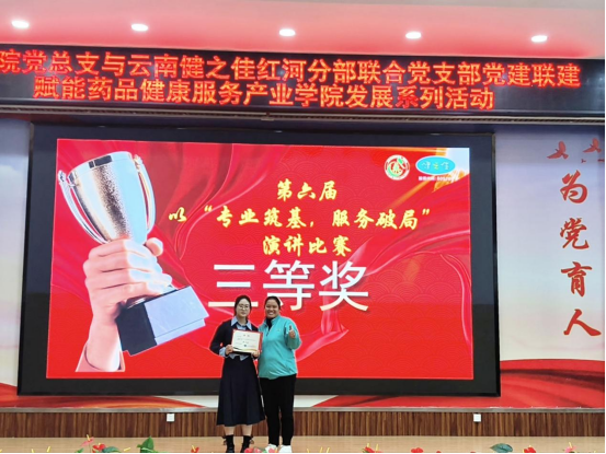 2025年11月26日下午,在厚德楼博闻报告厅,药学院党总支与云南健之佳红河分部联合党支部成功开展党建联建活动。双方以“传承红色基因,共筑健康未来”为主题,通过举办健之佳第六届演讲比赛、深化校企师资互培等一系列活动,共同赋能药品健康服务产业学院的高质量发展。红河一区地区经理黄芳、红河分部人事经理曹钟慧等一行5人,以及药学院党政领导、党员教师及代表、学生代表参加了此次活动。