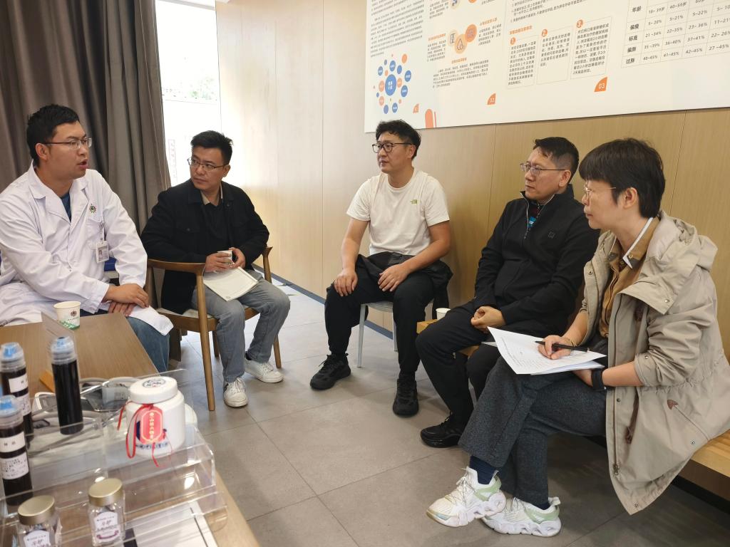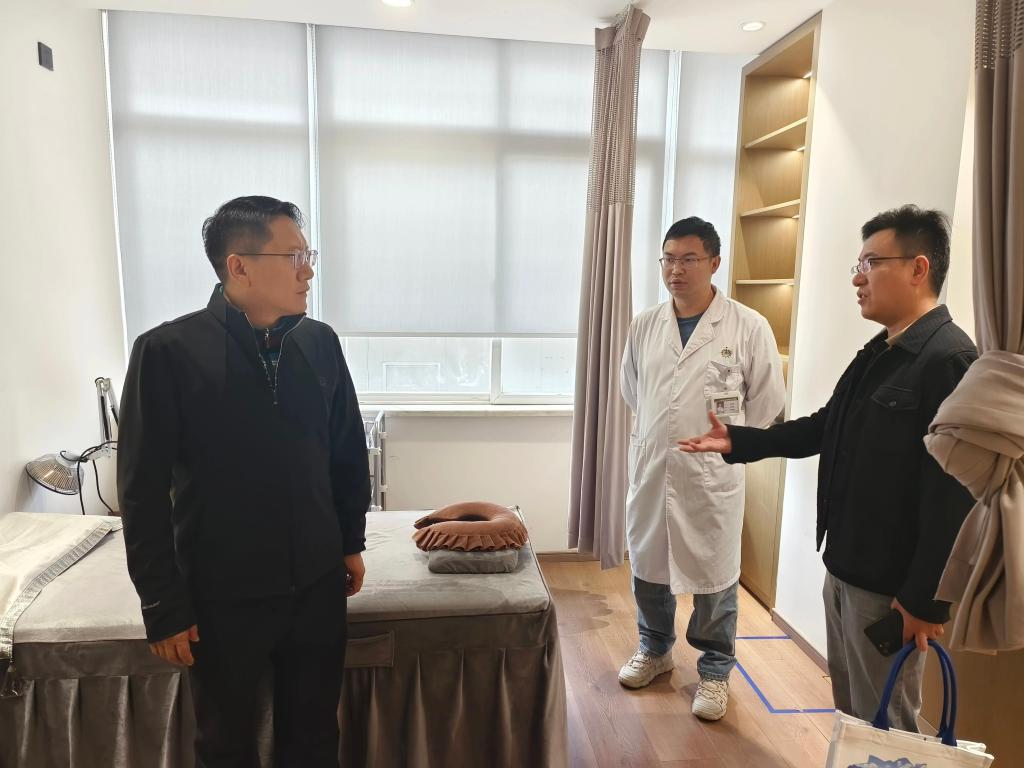 考察组深入中医馆各诊室,重点调研推拿、拔罐、刮痧等中医诊疗技术的标准化操作流程、智能诊疗设备应用情况和服务模式,详细了解了“提供平台+医生个人签约+AI操作”的创新运营模式,以及智能化诊疗系统、标准化手法培训体系和健康档案管理平台。