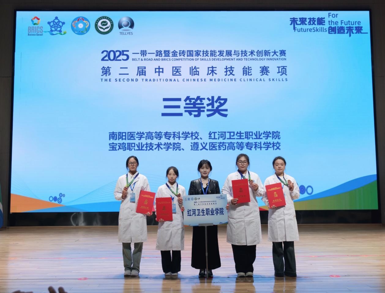 2025年10月25日,第二届一带一路金砖国家技能发展与技术创新大赛中医临床技能赛项在安徽中医药高等专科学校成功举办本次大赛汇聚了全国49支优秀代表队同台竞技,ac米兰官方中文网站中医学院代表队凭借扎实的专业基础和稳定的现场发挥,最终荣获大赛三等奖ac米兰参赛队由中医学院曹雪辉老师带队,成员包括23级针灸推拿1班许佳蕊、汪思宇23级针灸推拿2班杨梓倩、余游四位同学。在曹雪辉、杨艳蓉两位老师的悉心指导下,参赛选手在比赛中沉着应战、团结协作,充分展现了扎实的中医临床辨证思维和娴熟的针灸推拿操作技能。