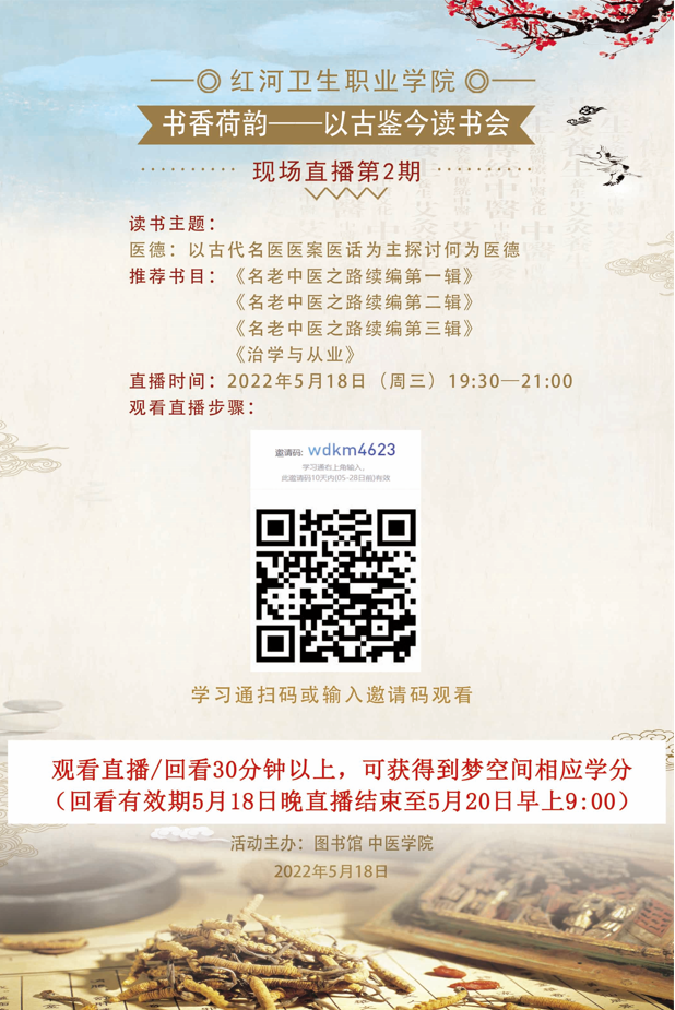 为丰富同学们的课余生活,提高阅读兴趣,2022年5月18日19:30,图书馆与中医学院联合举办了第二期“书香荷韵—以古鉴今读书会”。本期读书会由中医学院团委、学生会社团工作部陈曜冉和李倩两位同学主持,现场有27位同学参加,线上有400余人观看直播,图书馆志愿者协会活动部协助布置会场、协会宣传部负责直播等,图书馆馆长潘欣、副馆长赵健美等三位老师、及中医学院副院长马佩宏亲临现场指导读书会的开展。